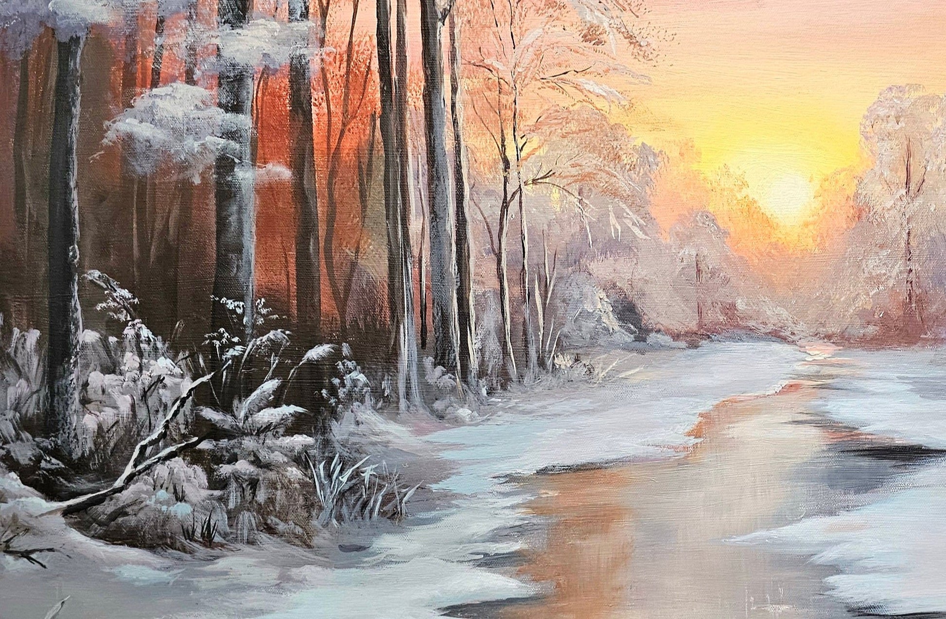 A winter landscape. A captured moment in time when the sun, snow, and land come together melding to produce a winter wonderland full of light and promise. Snow can represent many things in both literature and art, for Llewellyn in this painting it represents peace.