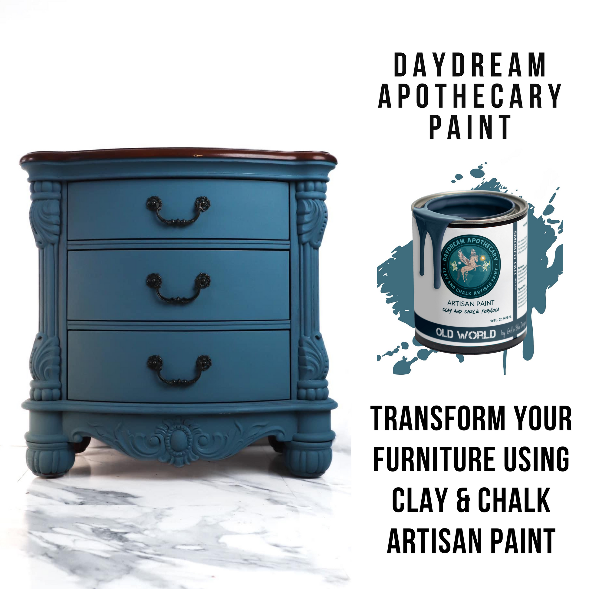 Daydream Apothecary has created the most vibrant smoked bluish gray paint for artists and DIY furniture designers. Our proprietary artisan paint formula, has low volatile organic compounds (VOCs), reconstitutes with water, and blends beautifully. This amazing new hybrid clay and chalk formula, was designed to adhere to most all surfaces without the need to prep or prime.